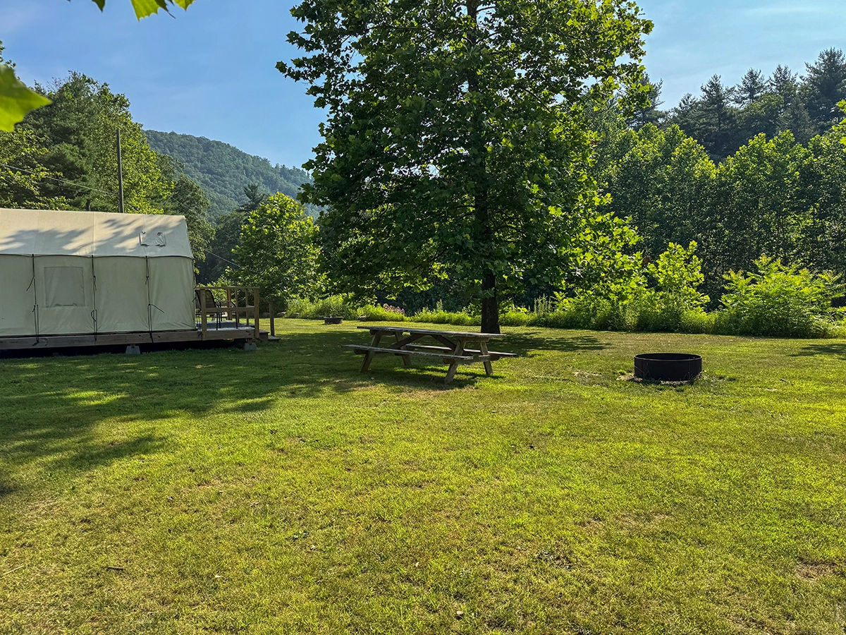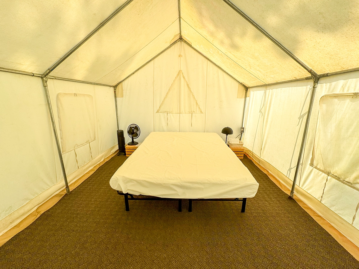 - Amenities – To keep cost and maintenance down, our Canvas Tent does not include any bedding or other camping supplies. It is only outfitted with a 2-person queen bed and end tables. There is a standard 3 prong outlet outside with power strip. We recommend bringing lanterns or other lighting, portable fan or A/C. Fire ring and picnic table also provided.
