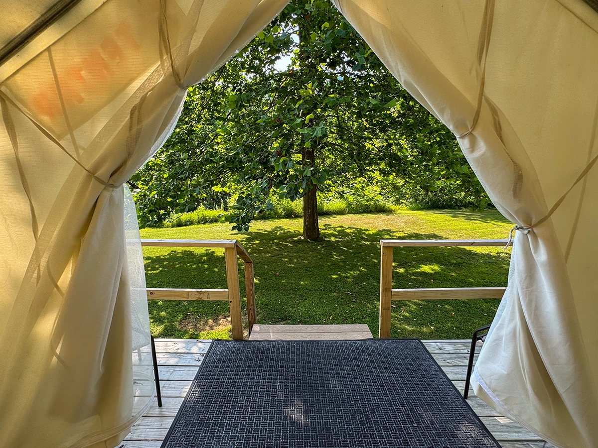 - Occupancy – Our tent is a modest 12×12 outfitted with one queen bed that sleeps 2 people comfortably. Because of it’s size, this tent is limited to 2 adults and 2 children. There is room to add a small cot or pack-n-play. NO PETS are allowed in our Canvas Tent.