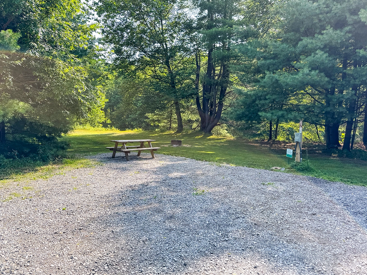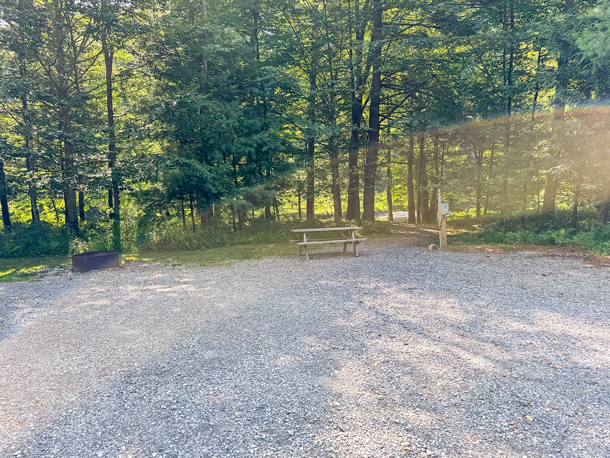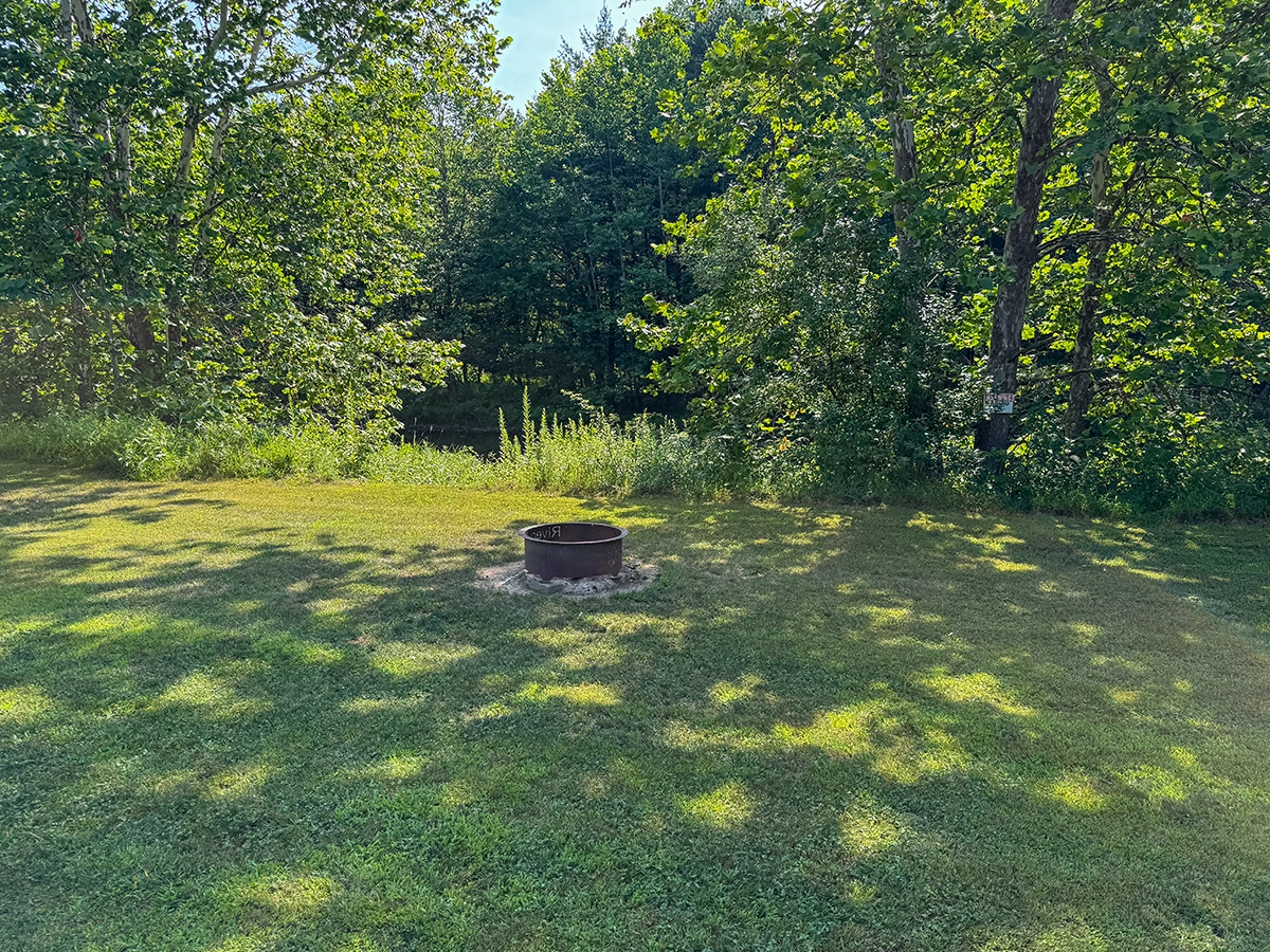Site Layout: Gravel pad with limited grass area, fire ring and picnic table. Grass area is small, therefore this site is not recommended for tents.