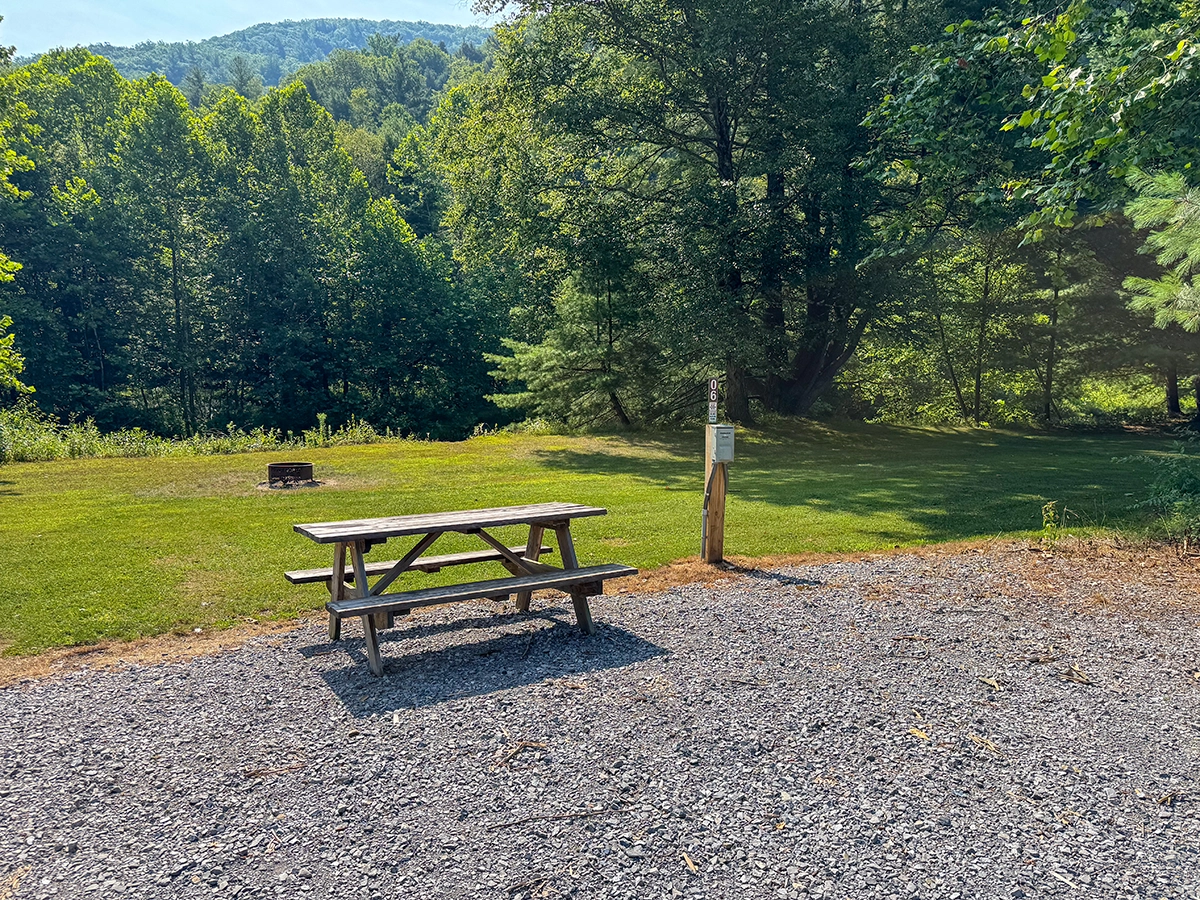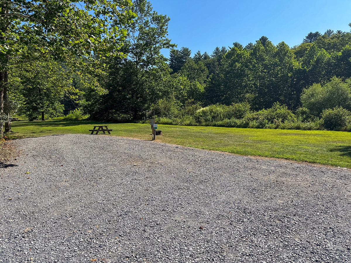 Site Layout: Large gravel pad with grass area, fire ring and picnic table. Gravel extends into the shade. You may BACK IN to this extension area but please do not drive on grass.