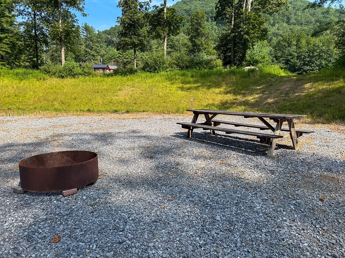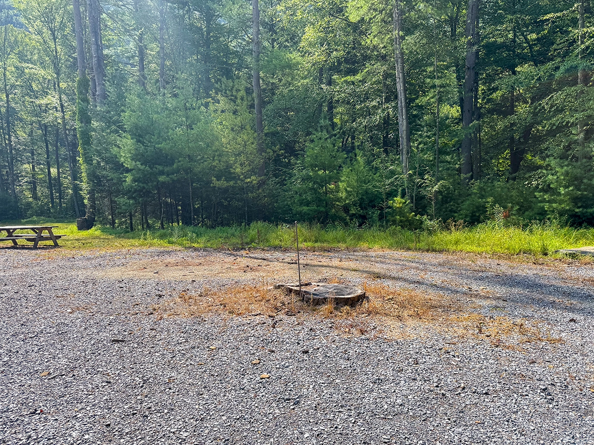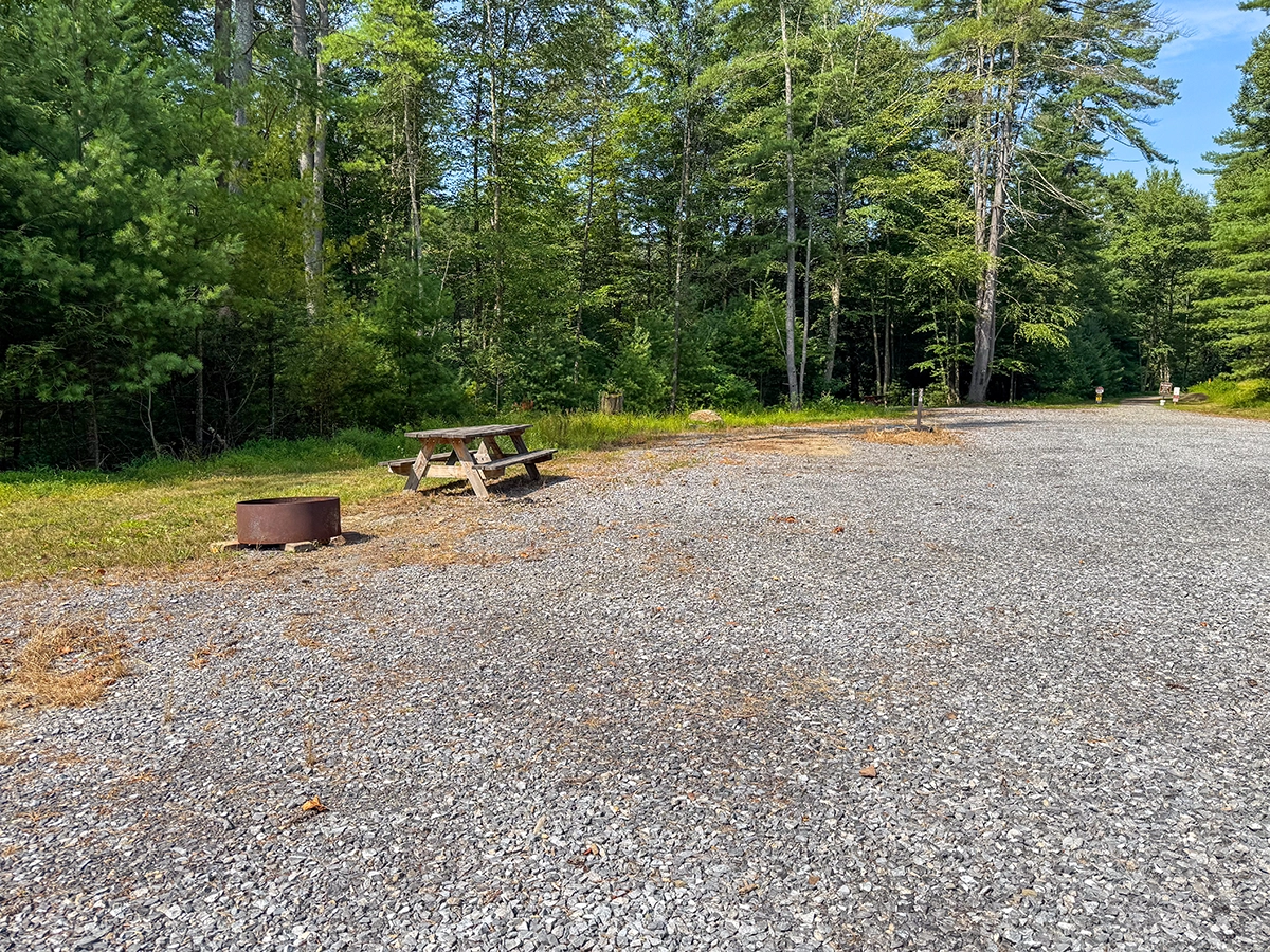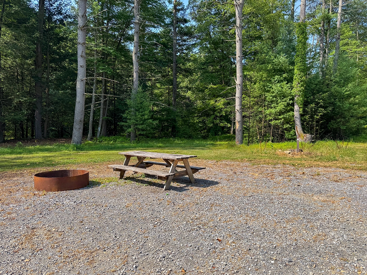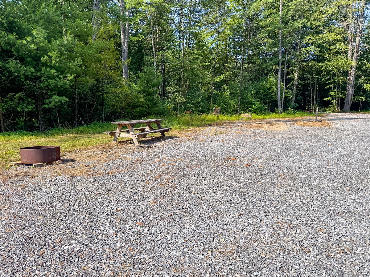 Site Layout: Extra large gravel area, fire ring and extra large picnic table