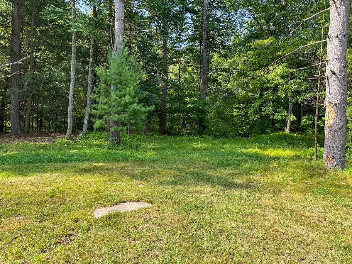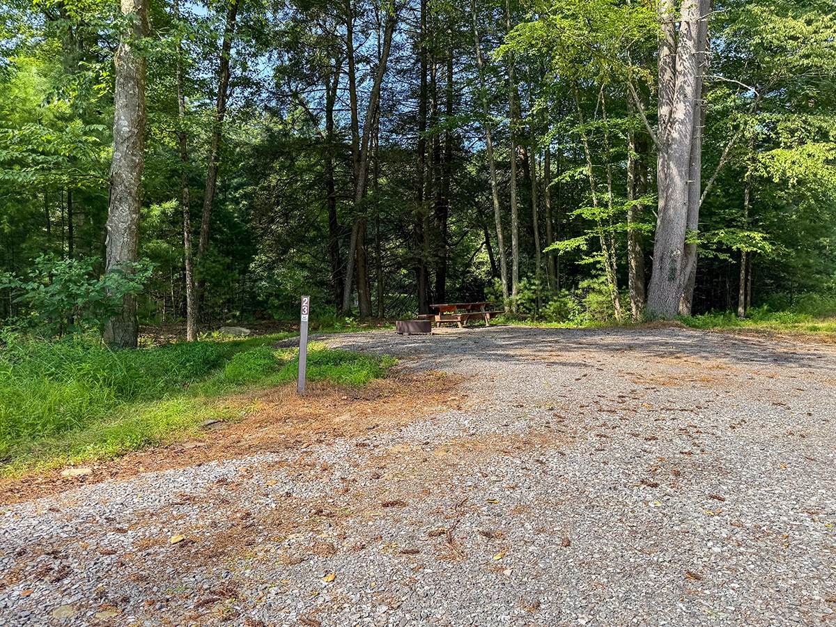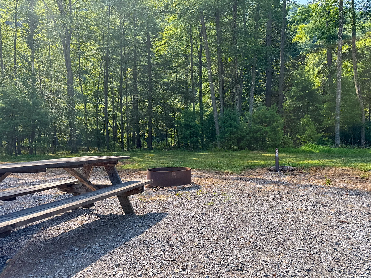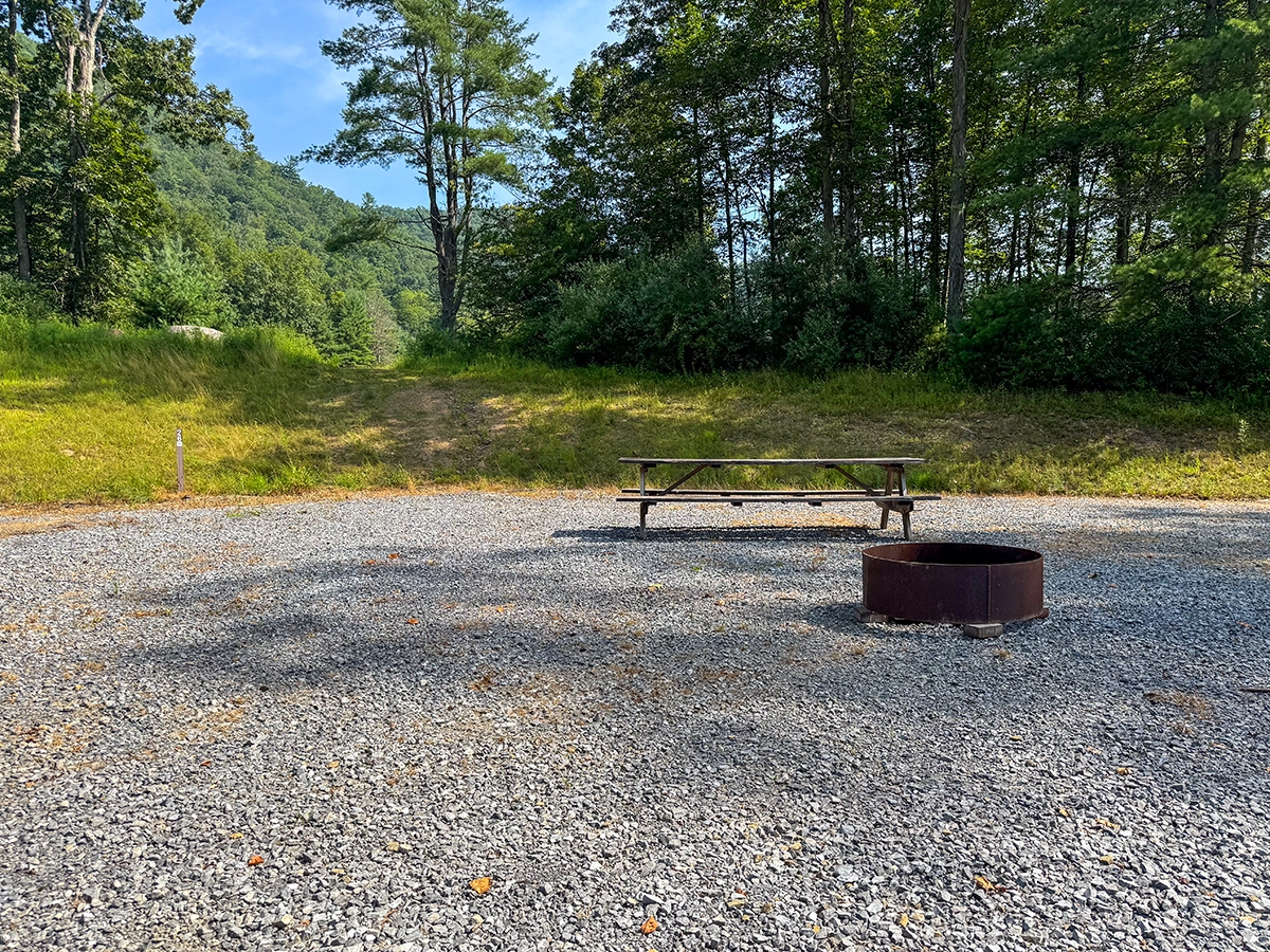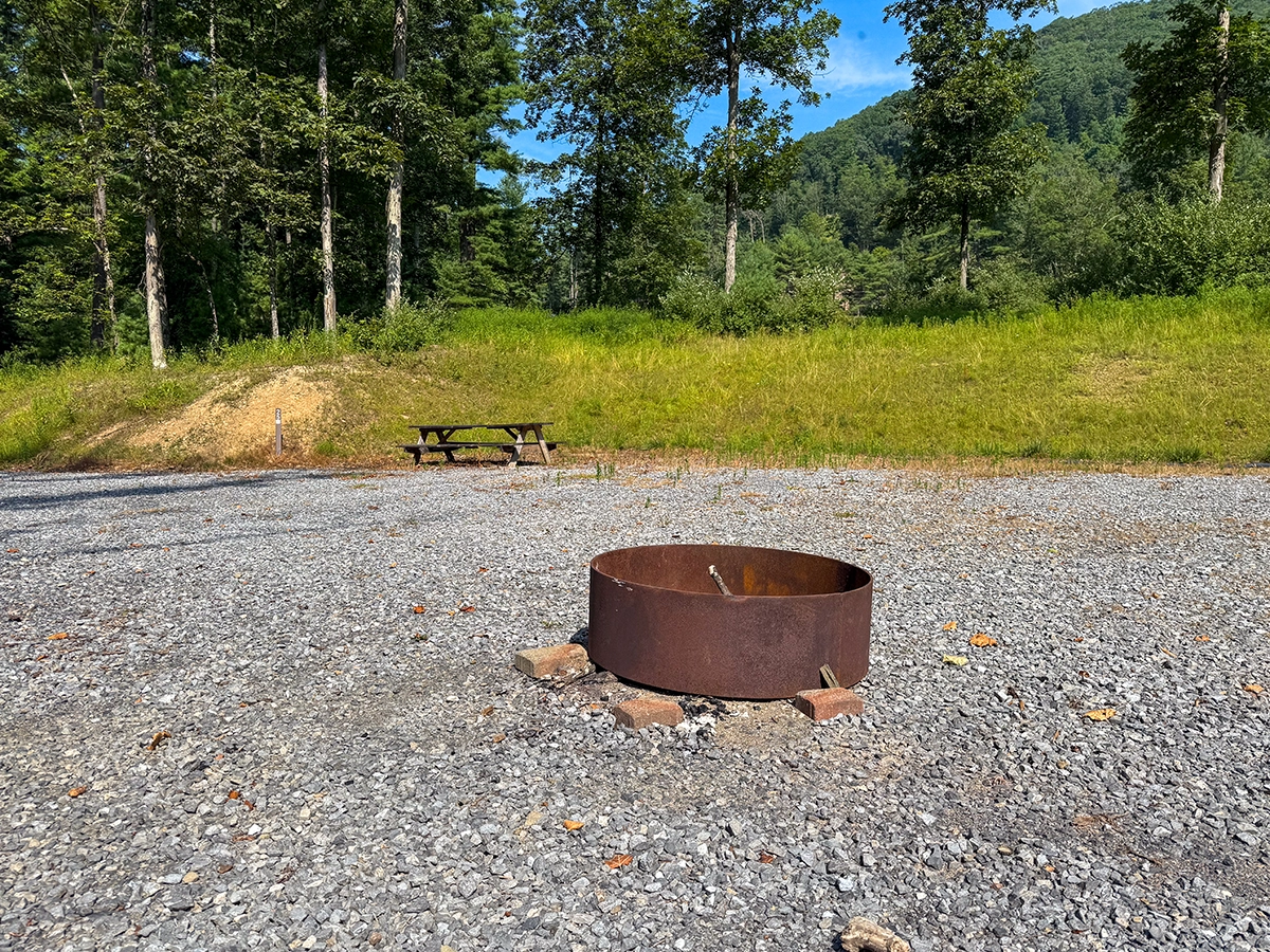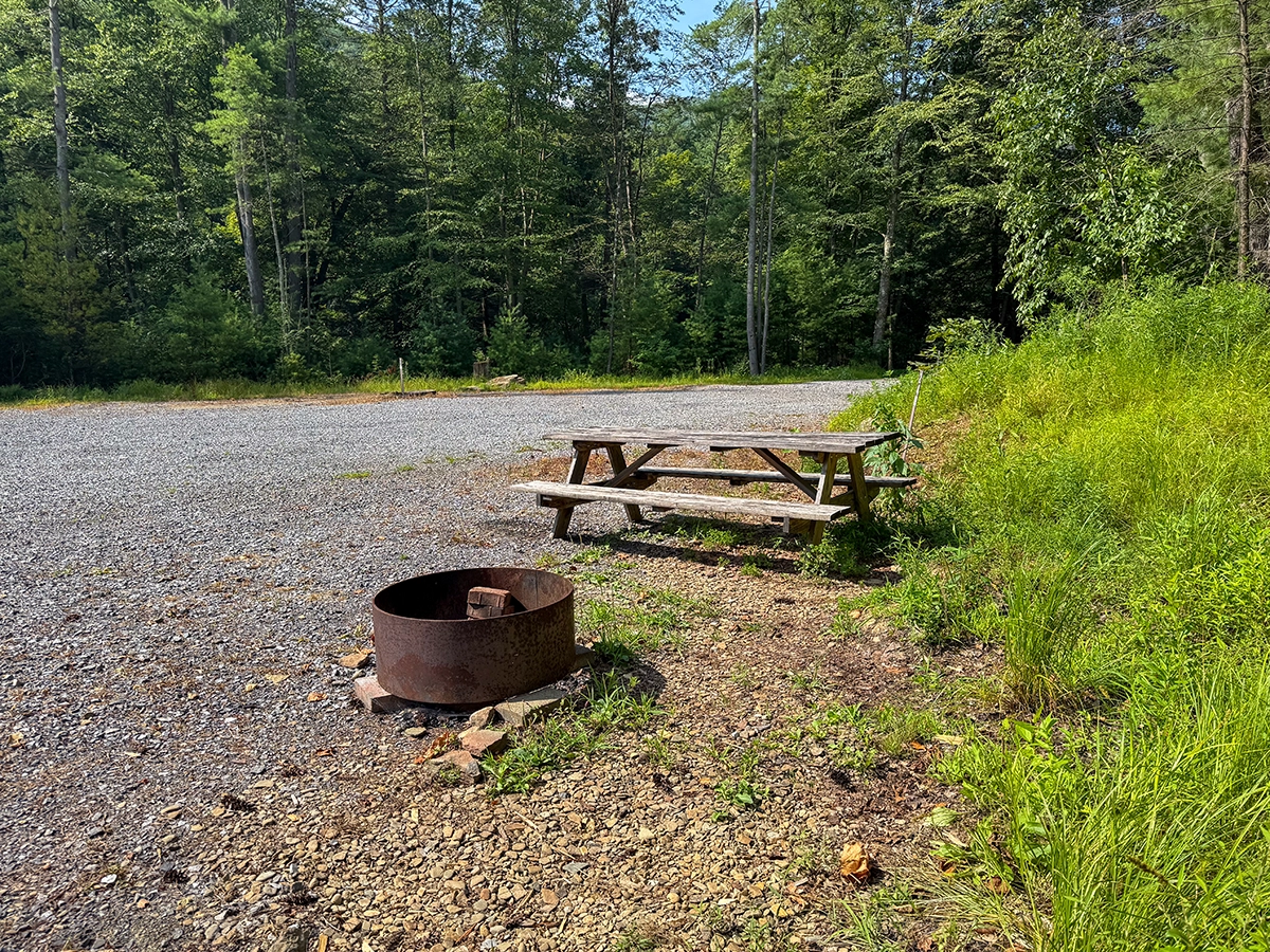 Site Layout: Extra large gravel area, fire ring and extra large picnic table